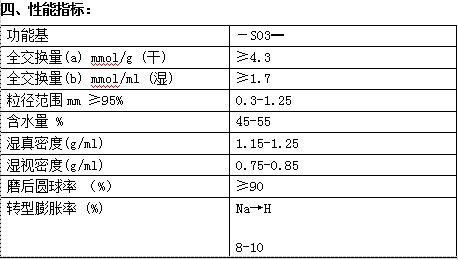 D001是在大孔結構的苯乙烯 — 二乙烯苯共聚體上帶有磺酸基(— SO3H)的陽離子交換樹脂。