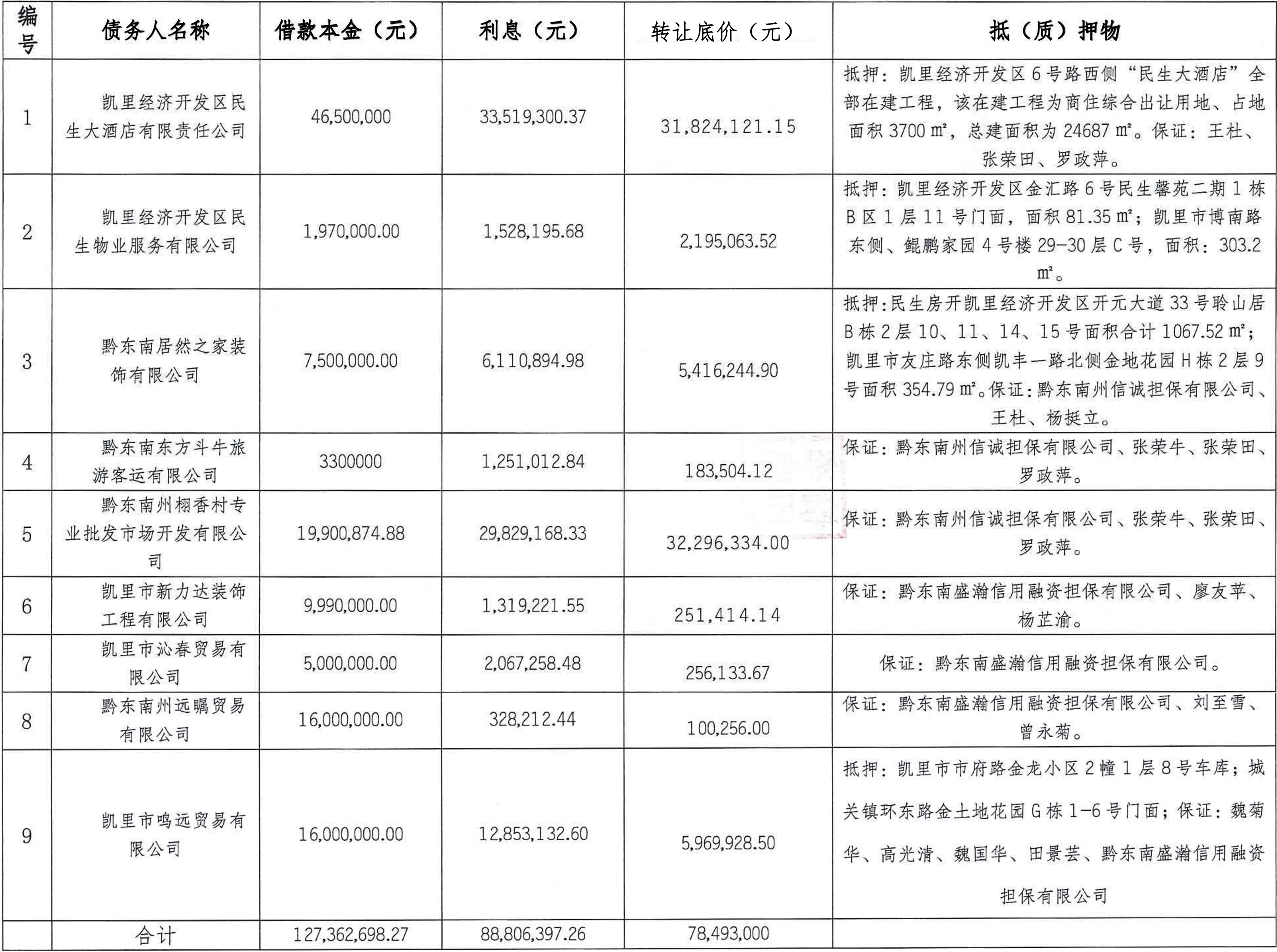 凱里經(jīng)濟(jì)開發(fā)區(qū)民生大酒店有限責(zé)任公司等 9 戶債權(quán)資產(chǎn)包整體轉(zhuǎn)讓
